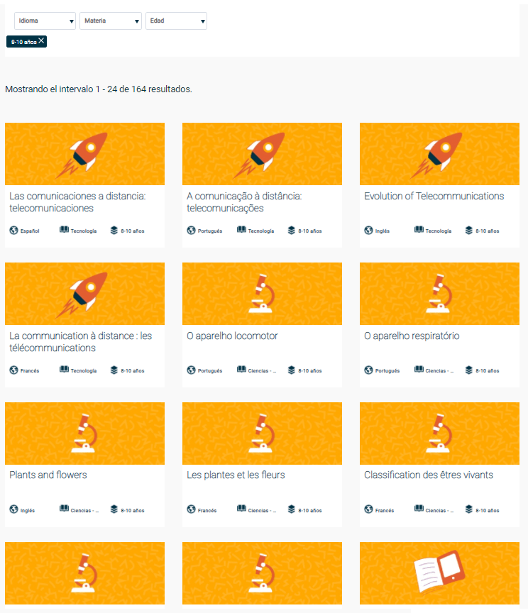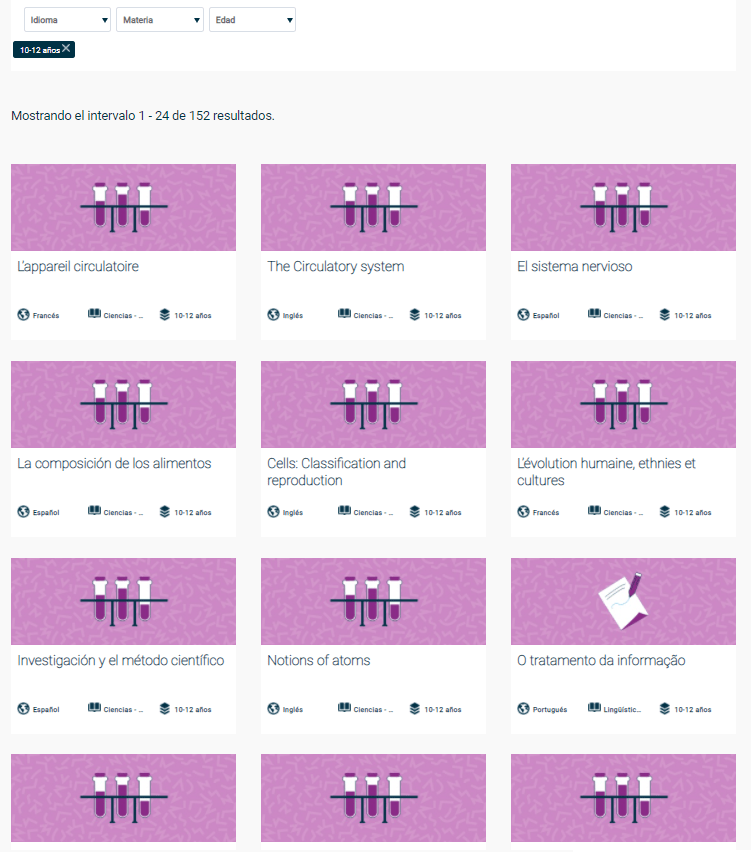 Os conteúdos agrupados por conteúdo, disciplina, idioma e idade.